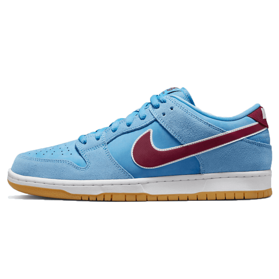 Dressed in a University Blue, Team Red, and White color scheme. This offering of the Nike SB Dunk Low features a University Blue suede upper paired with Team Red Swooshes and White leather trimming. Highlighting the shoe is a touch of Pink on the heel of the Gum rubber outsole similar to the Air Jordan 1 “Bubblegum” released in December. This small detail is a nod to baseball players chewing large amounts of bubblegum in the dugout. Finishing off the Philly theme is the Liberty Bell motif on the left inner tongue and a Philly cheesesteak on the right.