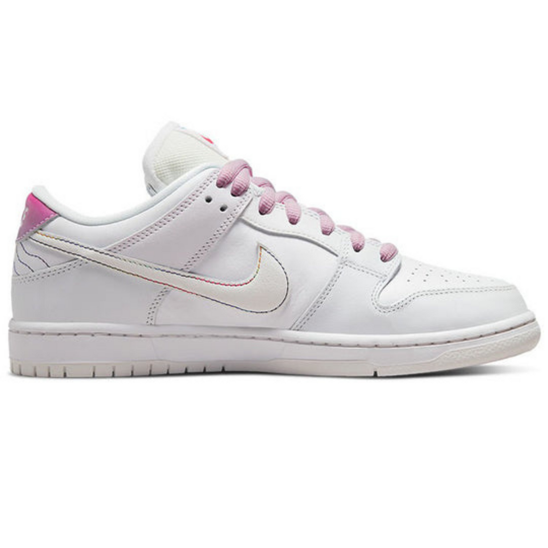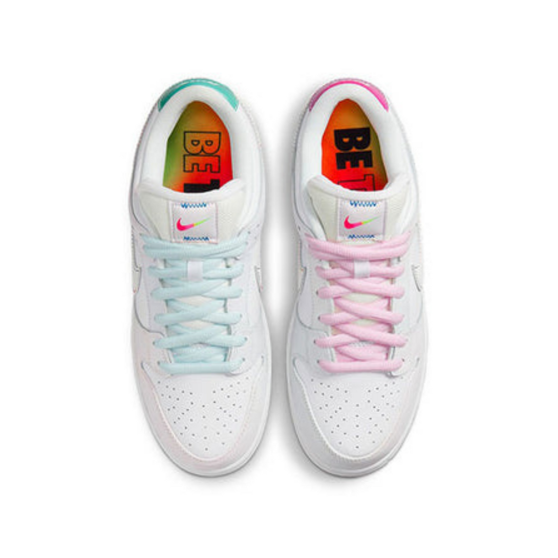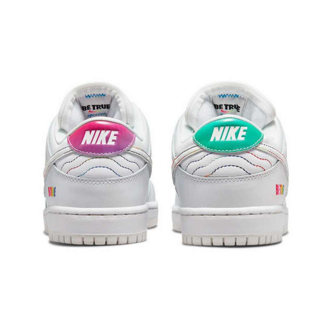 The Nike SB Dunk Low 'Be True' is a vibrant and meaningful iteration of the iconic Dunk silhouette, designed to celebrate inclusivity and individuality. This edition is part of Nike's 'Be True' campaign, which supports and honors the LGBTQ+ community. The sneaker features a rainbow color palette, symbolizing diversity and the wide spectrum of human identities. Crafted with premium materials, the upper showcases a blend of textures and colors, each representing different facets of the LGBTQ+ flag. Comfort is prioritized with a padded collar and Zoom Air cushioning, providing excellent support for skateboarding and daily wear. The 'Be True' message is further highlighted through unique design details, making this sneaker not just a fashion statement but a powerful symbol of equality and acceptance. The Nike SB Dunk Low 'Be True' stands as a testament to the brand's commitment to diversity and the celebration of all identities.