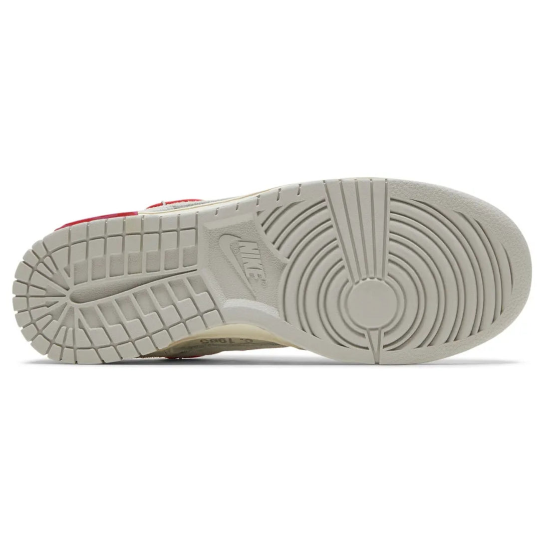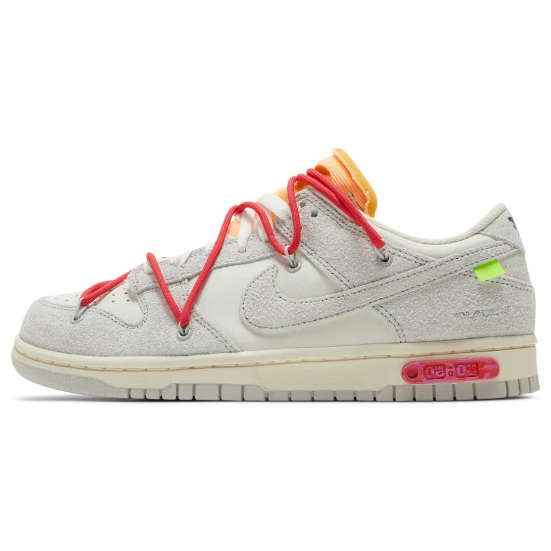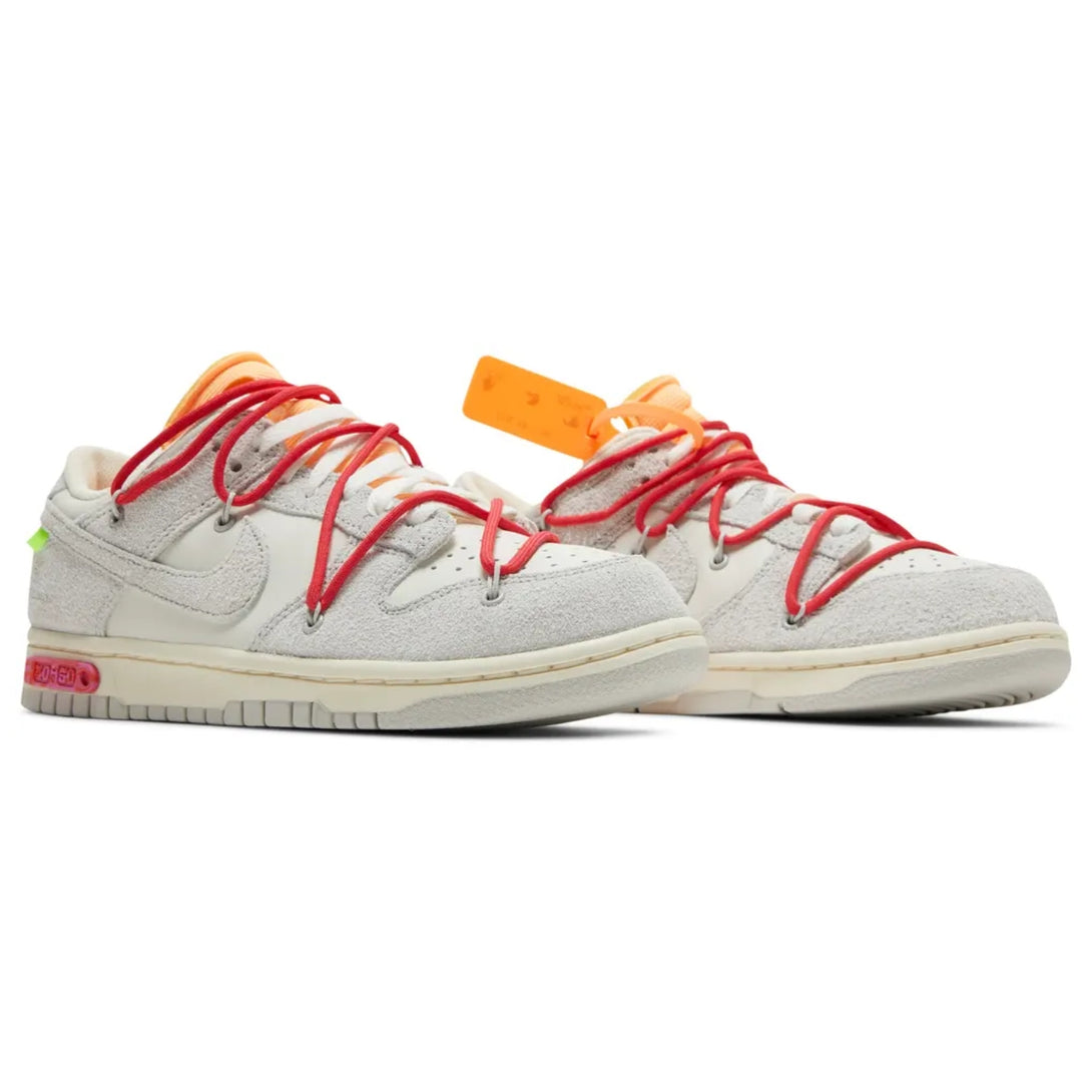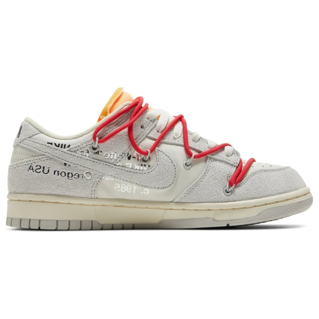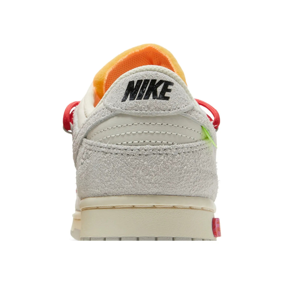 The Off-White x Nike Dunk Low 'Lot 40 of 50' is an exceptional model from Virgil Abloh's explorative series that merges classic sneaker design with avant-garde details. This version stands out with a base of muted grey suede complemented by deep forest green leather overlays, presenting a refined yet earthy aesthetic. Signature elements of the Off-White brand are prominent, including the iconic orange zip-tie, a secondary lacing system that wraps around the upper for a contemporary twist, and printed textual details on the medial side that provide an industrial touch. The sneaker also features the characteristic exposed foam tongue and a distressed, speckled sole, underscoring the deconstructed theme that is central to Abloh’s design philosophy. 'Lot 40' blends subtle elegance with statement-making design, perfect for those who appreciate the intersection of high fashion and streetwear.