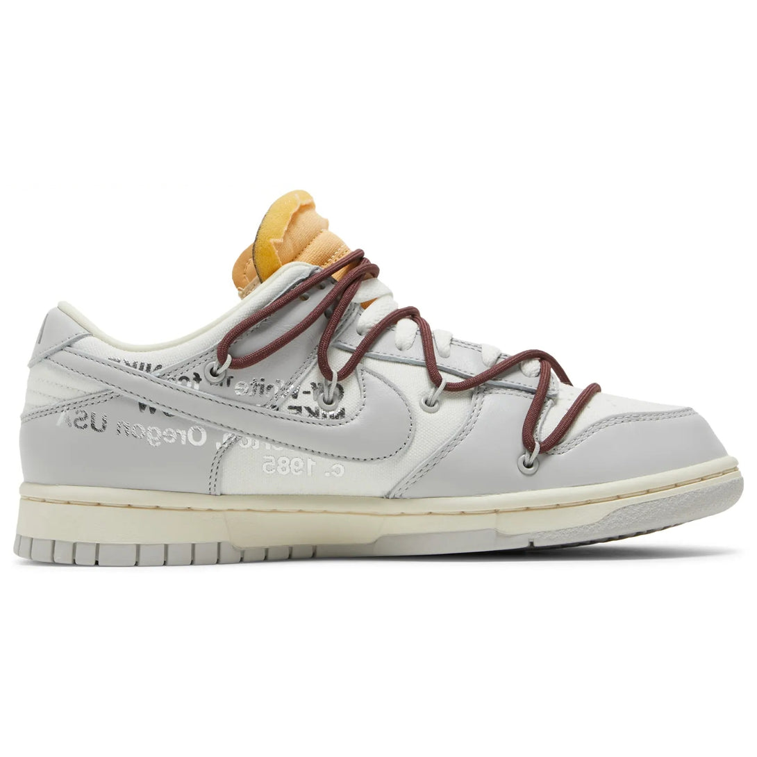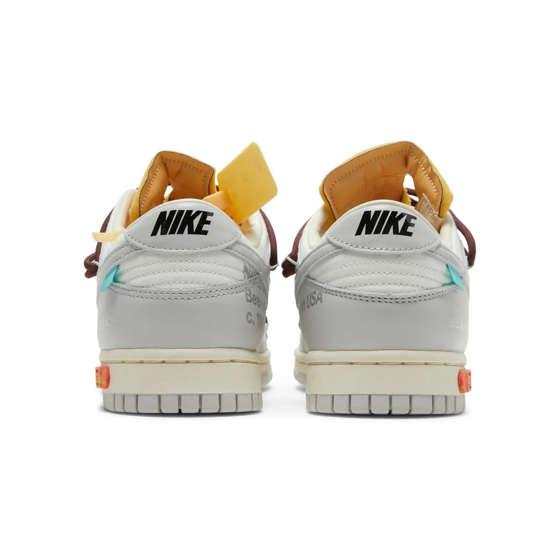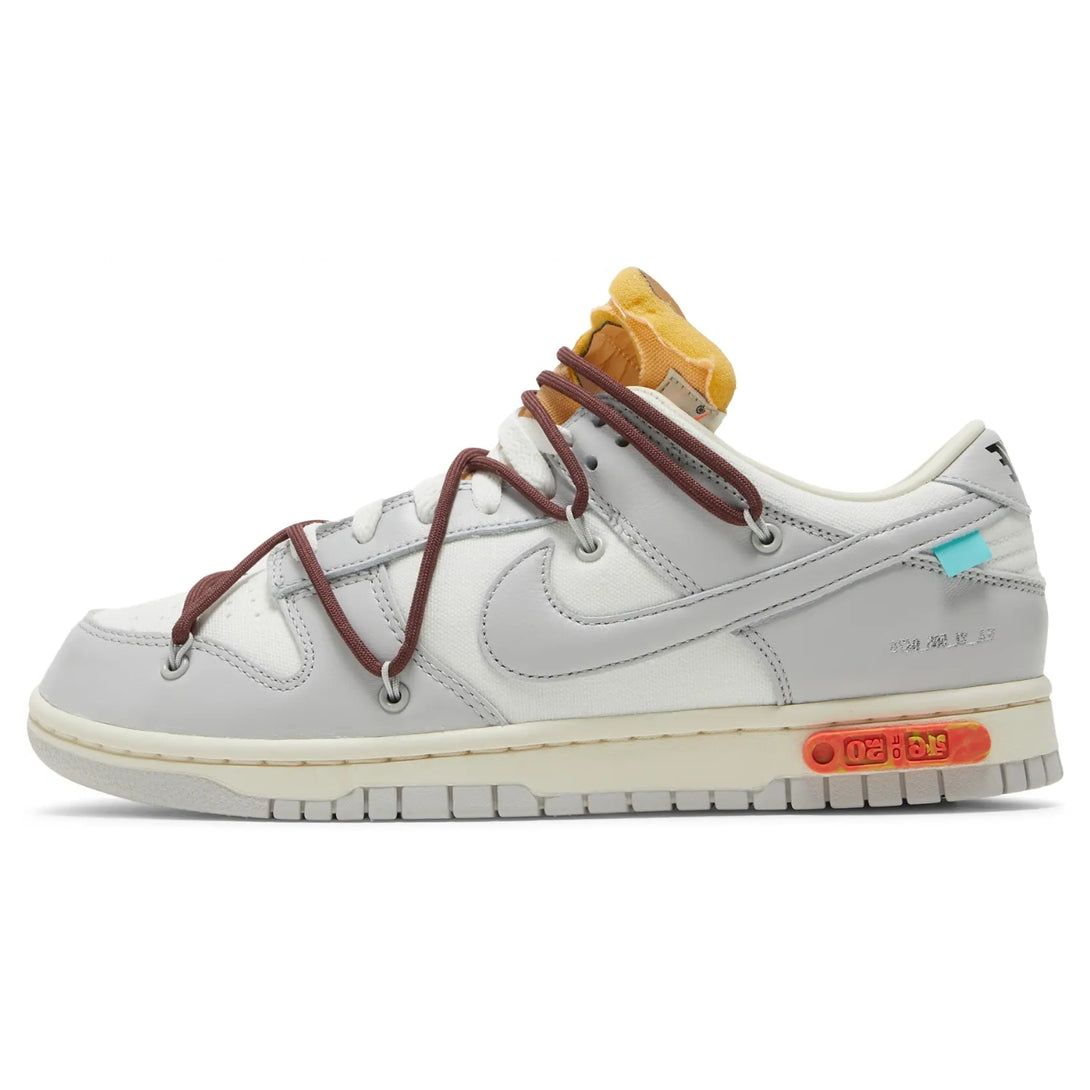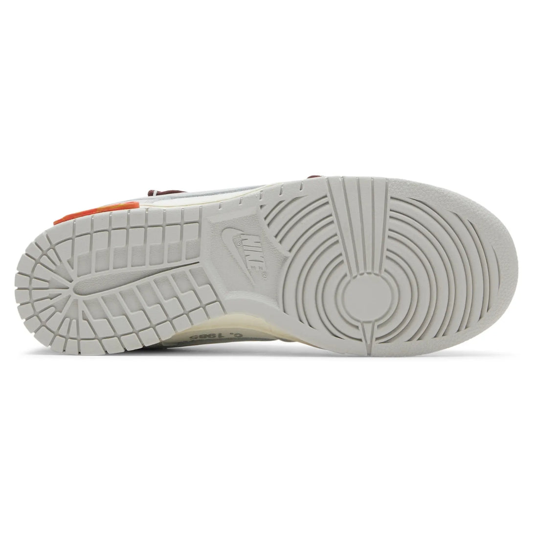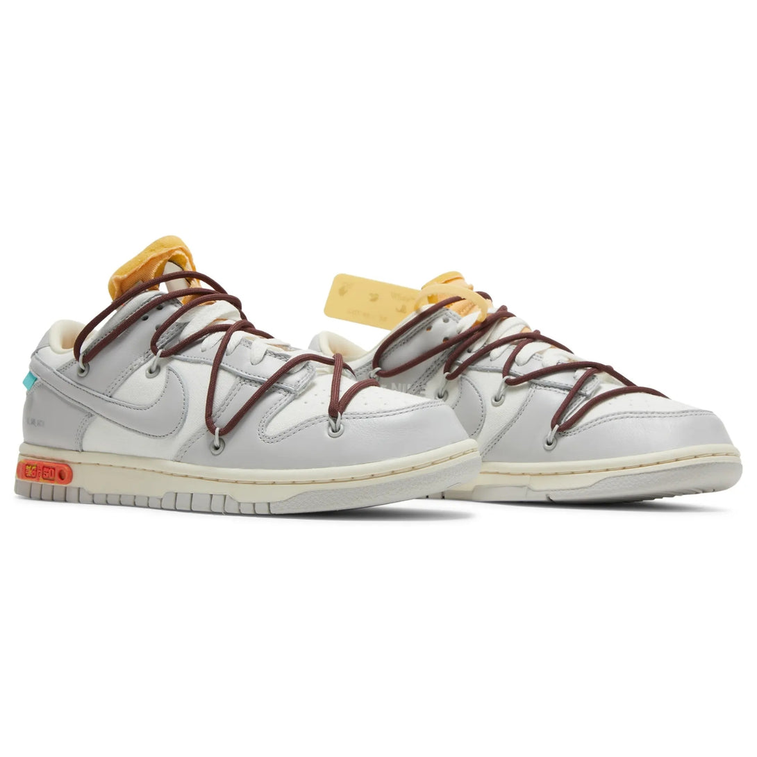 The Off-White x Nike Dunk Low 'Lot 46 of 50' is a standout piece in Virgil Abloh's innovative series, showcasing a bold approach to the classic Dunk design. This edition features a striking contrast with a deep navy blue leather base paired with vibrant green overlays, setting a dramatic tone. The design retains signature Off-White elements such as the bright orange zip-tie, the secondary lacing system that adds a contemporary layer of complexity, and the industrial-inspired text on the medial side, highlighting the sneaker’s unique identity. Additionally, the silhouette is enhanced with exposed foam edges and a pre-distressed rubber outsole, encapsulating Abloh’s penchant for deconstructed aesthetics. 'Lot 46' is a celebration of street culture and high fashion, making it a must-have for sneaker enthusiasts and collectors alike.